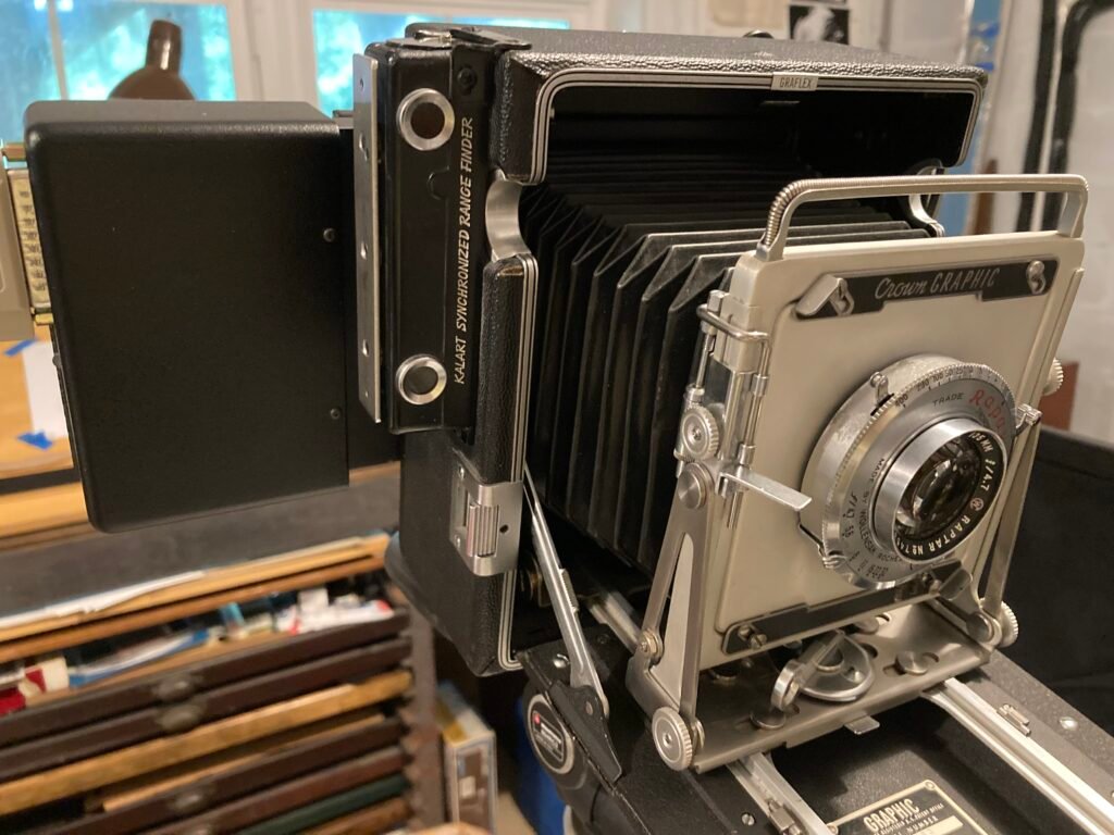 My 50-70 year old Crown Graphic is now a digital camera. The scan back fits in where the sheet film holder would normally reside. What you don’t see is the small control box, computer, and cables that make it work. Definitely not a point and shoot!
