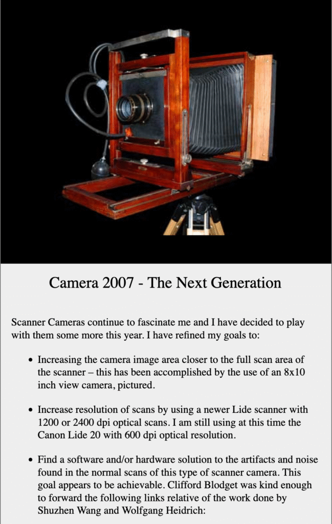 However there are some additional pieces to the puzzle of scanner photography, which were recently forwarded to me that I would like to share. One of the problems relative to these cameras is the digital artifacts and noise that appear in the photographs. That is why you can build your own camera for a couple hundred dollars or less vs. buying a large format digital back from Betterlight which works on basically the same principle for considerably more (Their latest and I believe highest resolution unit was recently introduced at $23,000.), or so it appeared.